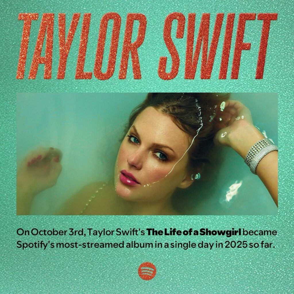 Los Ángeles, California.– Taylor Swift volvió a hacer historia en la industria musical. Su más reciente producción discográfica, The Life of a Showgirl, se convirtió en el álbum más reproducido en un solo día en Spotify en lo que va de 2025, alcanzando esta marca en menos de 12 horas desde su lanzamiento.