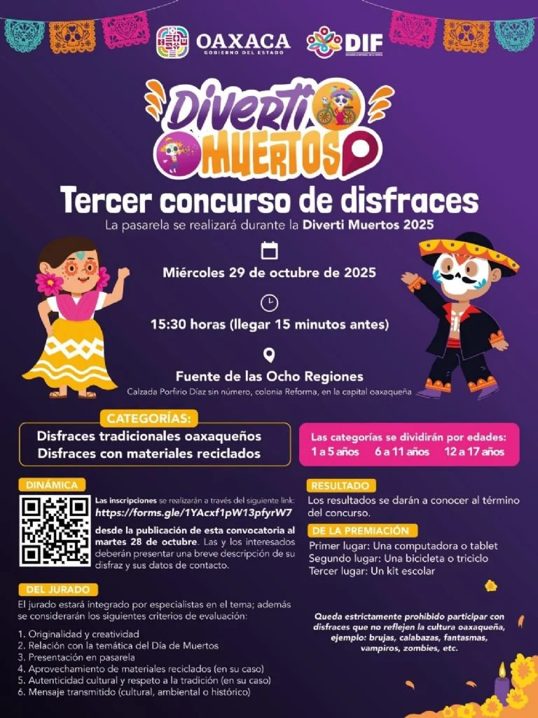 El Sistema Estatal para el Desarrollo Integral de la Familia (DIF) anunció la tercera edición del Diverti Muertos 2025, con el que las infancias de Oaxaca celebrarán el Día de Muertos, la Fiesta Más Viva de Todas. La actividad que se realizará el próximo 29 de octubre bajo la temática «Diablos y leyendas oaxaqueñas», incluirá una comparsa y concurso de disfraces.