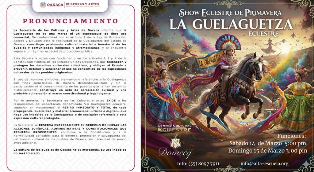 A su vez, la Secretaría de las Culturas y Artes exigió a las y los responsables del espectáculo denominado “La Guelaguetza ecuestre, tradición en movimiento”, el retiro inmediato y total de toda propaganda, publicidad y material promocional —físico o digital— que haga uso o referencia indebida a esta expresión cultural protegida.